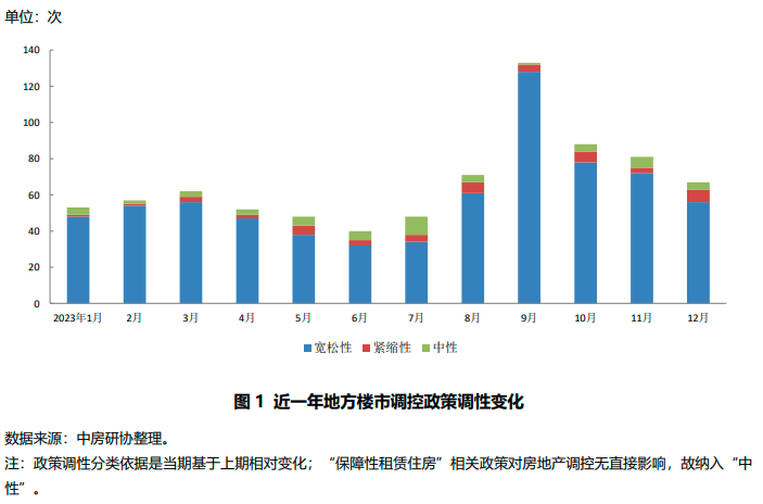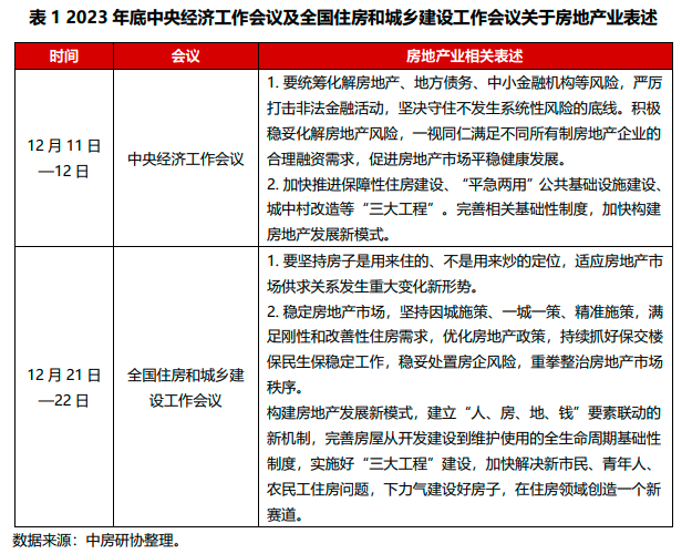 2023年12月,我国房地产政策延续宽松走向。中央层面,中央经济工作会议将房地产列为防范化解重点领域风险的首位,强调要积极稳妥化解房地产风险,一视同仁满足不同所有制房地产企业的合理融资需求,促进房地产市场平稳健康发展;全国住房和城乡建设工作会议则明确要坚持“房住不炒”定位,适应房地产市场供求关系发生重大变化新形势,优化房地产政策,持续做好保交楼保民生保稳定工作,稳定房地产市场。此外,两次重要会议均提出,要加快推进保障性住房建设、“平急两用”公共基础设施建设、城中村改造等“三大工程”,加快构建房地产发展新模式等。