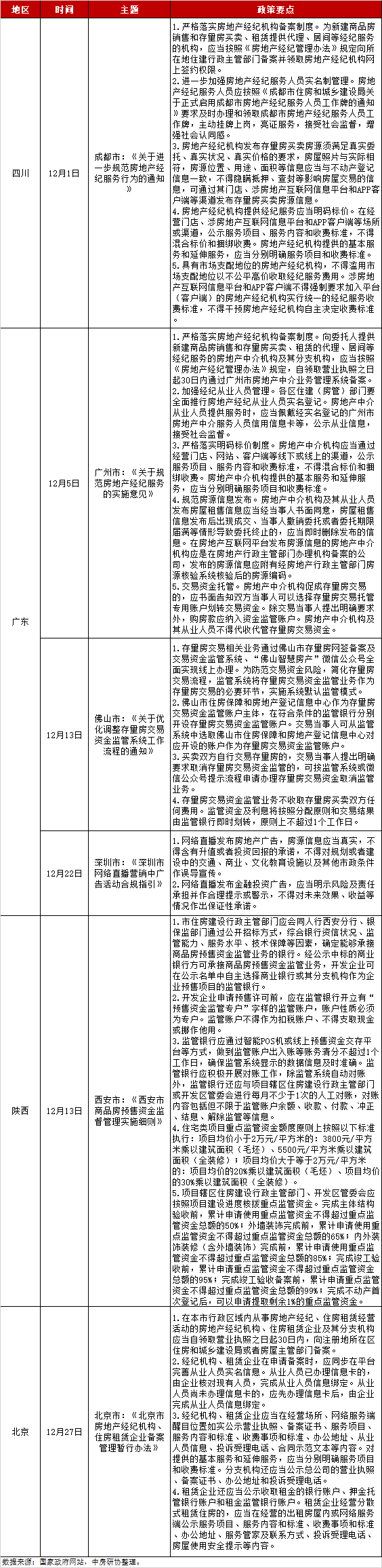紧缩性政策主要涉及房地产经纪服务监管和房企资金监管。典型代表有:成都、广州严格落实房地产经纪机构备案制度、加强经纪从业人员管理、严格落实明码标价制度、规范房源信息发布等;佛山将存量房交易资金监管业务作为存量房交易的必要环节,实施系统默认监管模式;西安发布商品房预售资金监督管理实施细则,要求房企设立“预售资金监管专户”,要求监管银行与项目辖区住房建设行政主管部门或开发区管委会进行每月不少于1次的人工对账,对账内容包括但不限于监管账户余额、收款、付款、冲正、结息、解除监管等信息。