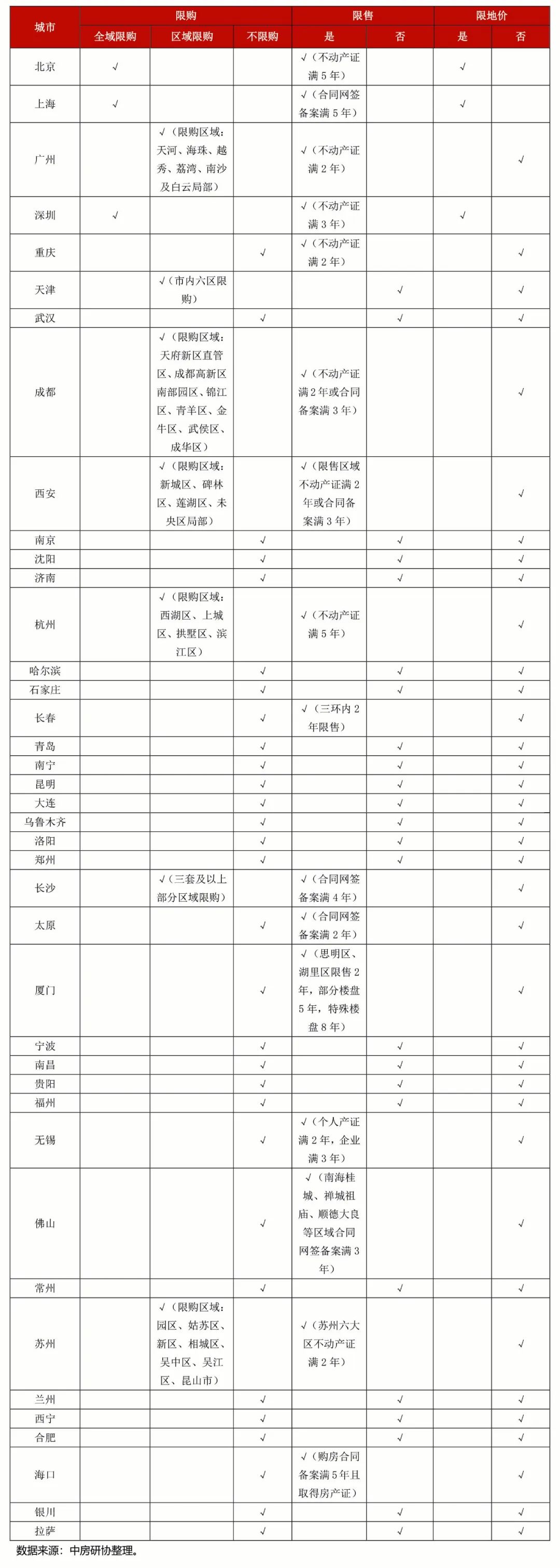 (1)限购方面,执行全域限购政策的城市有4个,分别为北京、上海、深圳、海口;执行区域限购政策的有7个,分别为广州、成都、西安、杭州、苏州、长沙、天津;其他29个城市均不限购;