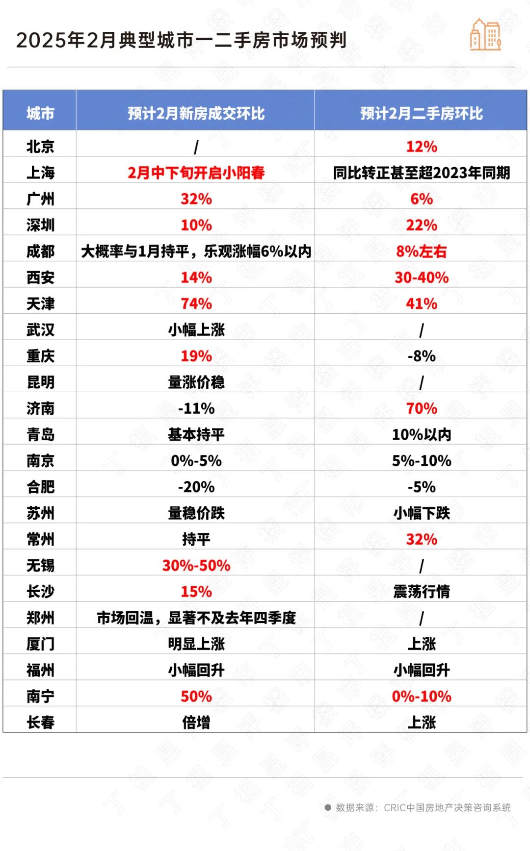 具体城市来看,上海有望在2月中下旬迎来小阳春行情,深圳2月新房成交预期环比涨幅也在10%左右。